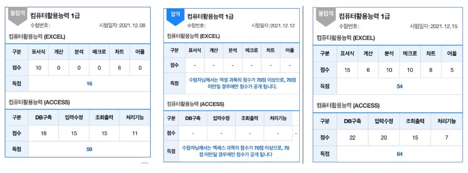 - 엑셀: 70점 이상 (정확한 점수 확인 X)